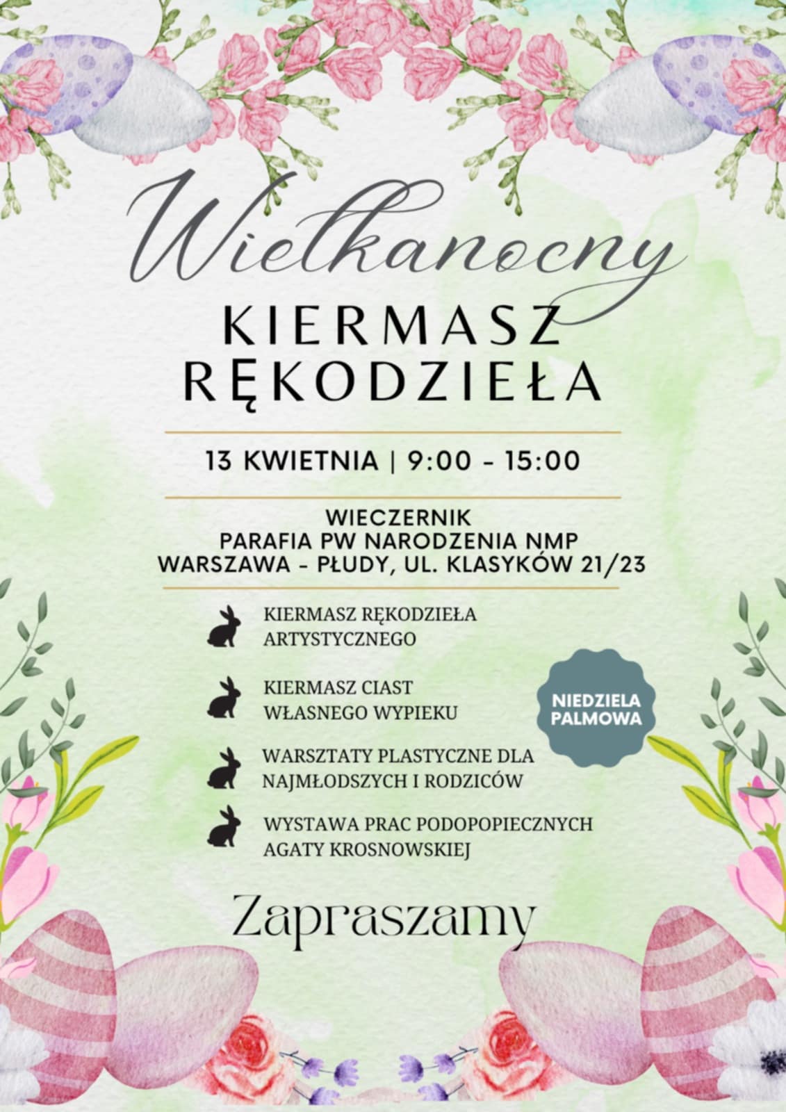 - Kiermasz Rękodzieła i Ciast w niedzielę Palmową 13 kwietnia od godz. 9:00 do 15:00. Prosimy o upieczenie i przyniesienie ciast i przyniesienie ich do Wieczernika.